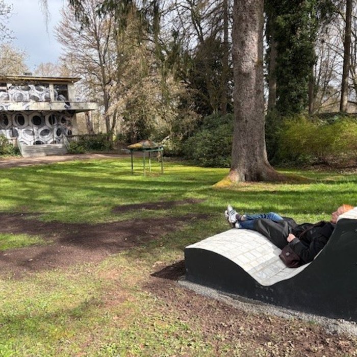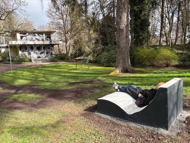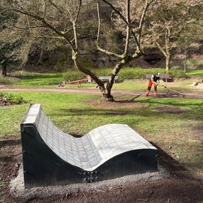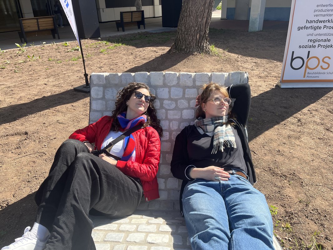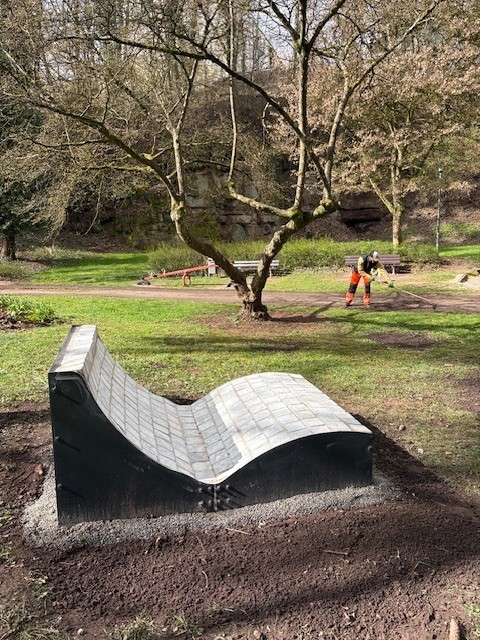 Das Projektvorhaben fand auch positives Echo beim Bürgermeister von Pirmasens Michael Maas– als steinernes Zeichen für eine Transformation von Gestern übers Heute ins Morgen. Nach der erfolgreichen Erstellung des Prototyps wurde dieser in der BBS Pirmasens im März 2025 feierlich und öffentlich eingeweiht. Seit kurzem haben zwei weitere Liegen ihren Standort im öffentlichen Raum gefunden und warten auf vielseitige Nutzung auf dem Waldfriedhof Pirmasens und im Neufferpark. Wir danken den Auszubildenden von André Jankwitz, Amtsleiter des Friedhof- und Grünflächenamtes und den SchülerInnen von Timo Heim, Lehrer und Teamleiter Teamleiter der Schülerfirma „BBS Kreativ", die diese schönen Liegen handwerklich gefertigt wie fachkräftig und standortbezogen aufgestellt haben.