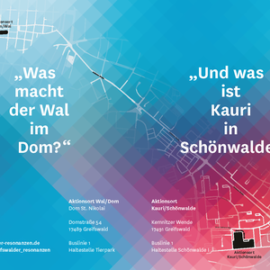 Dabei bildeten die zwei Aktionsorte Wal/Dom und Kauri/Schönwalde die beiden Pole der Projektaktivitäten. Der gotische Dom St. Nikolai ist prominent im historischen Greifswalder Zentrum gelegen und wird nicht nur von Anwohnenden, sondern vor allem tagtäglich von einer Vielzahl an Reisenden besucht. Etwa 4 km weiter, eher am Rande Greifswalds, befindet sich der Stadtteil Schönwalde. Er liegt weniger im Zentrum des touristischen Interesses, ist aber Wohnort und Lebensmittelpunkt vieler Greifswalder Bürgerinnen und Bürger. Die Plattenbausiedlungen Schönwalde I und Schönwalde II wurden ebenso wie das angrenzende Ostseeviertel ab den späten 60er Jahren erbaut, um mehr Wohnraum für die Arbeitenden des Kernkraftwerkes Lubmin zu schaffen und bietet heute Wohnraum für eine heterogene Mieterschaft. Der auf einer Wiese der evangelischen Johannes-Gemeinde zentral in Schönwalde gelegene Aktionsort für die künstlerischen Angebote wurde primär von den Anwohnenden gut genutzt. Die erhoffte Verbindung zwischen der Innenstadt und den Außenbezirken konnte allerdings während der begrenzten Laufzeit des Projektes aus unterschiedlichen Gründen nicht wirklich hergestellt werden. Allerdings sind Kontakte, Verbindungen und Beziehungen zu ganz unterschiedlichen Menschen geknüpft worden, deren (Aus)Wirkungen sich nach Projektende erst zeigen werden.